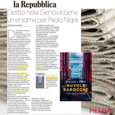 La prima indagine di Paolo Nigra (edito da Piemme) e firmato da Paolacci&Ronco, cioè Antonio Paolacci — ultimo titolo lo stupefacente Piano americano — e Paola Ronco, autrice tra l’altro di La luce che illumina il mondo, arrivati da tempo a vivere a Genova, come tradisce, oltre che l’ambientazione, l’ispirazione da De André: Ma il cielo è tutto rosso di nuvole barocche/ sul fiume che si sciacqua sotto l’ultimo sole.