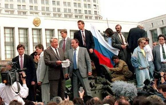 Poco più di un mese dopo, e cioè la mattina di lunedì 19 agosto, ci sorprende la notizia di un colpo di Stato a Mosca. Il presidente Mikhail Gorbaciov è stato sequestrato e sostituito dal suo vice Ghennadi Janaev. I carri armati presidiano le strade, in Occidente crollano le Borse e si trema all’idea di quel che potrebbe succedere, specie quando Bush senior chiama il Cremlino e gli sbattono il telefono in faccia. Eltsin sale in piedi su un carro armato e, con un megafono, condanna la Giunta golpista in diretta tv mondiale.