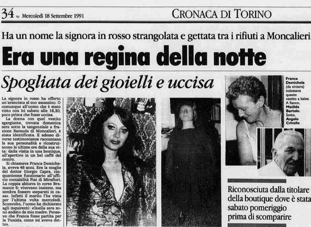 Una domenica di settembre del 1991, sotto un viadotto della tangenziale alla periferia di Torino, un senzatetto trova il cadavere di una donna vestita con un vistoso abito di chiffon rosso.