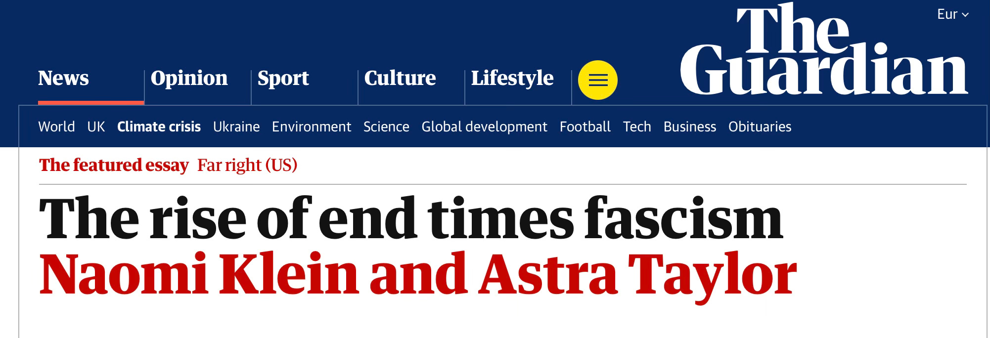 Vi consigliamo quindi di ascoltare – per esempio – l’episodio 85 del podcast Fuori da qui, intitolato Fascismo apocalittico, dove è spiegata bene “un’ideologia emergente all’interno dell’estrema destra americana che intreccia tecnologie futuristiche, fondamentalismo religioso, visioni elitiste e una totale rinuncia alla possibilità di un futuro condiviso”, a partire dall’articolo The rise of end times fascism, apparso sul Guardian lo scorso 13 aprile.