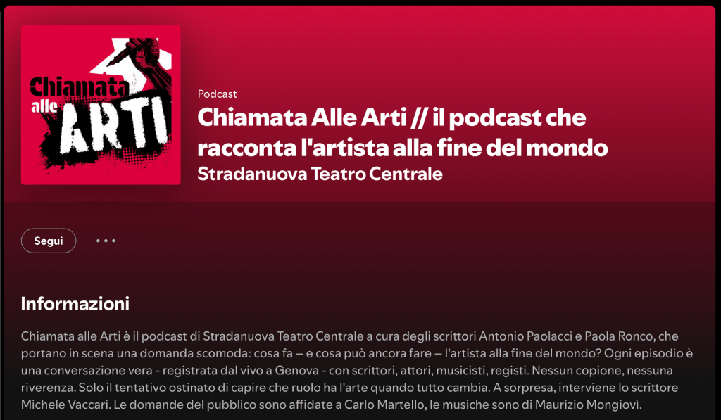 Il momento è arrivato. A partire da oggi, 19 aprile, Chiamata alle Arti – il podcast dal vivo nato dalla nostra collaborazione con il Teatro Stradanuova di Genova – è disponibile su tutte le principali piattaforme audio e video.